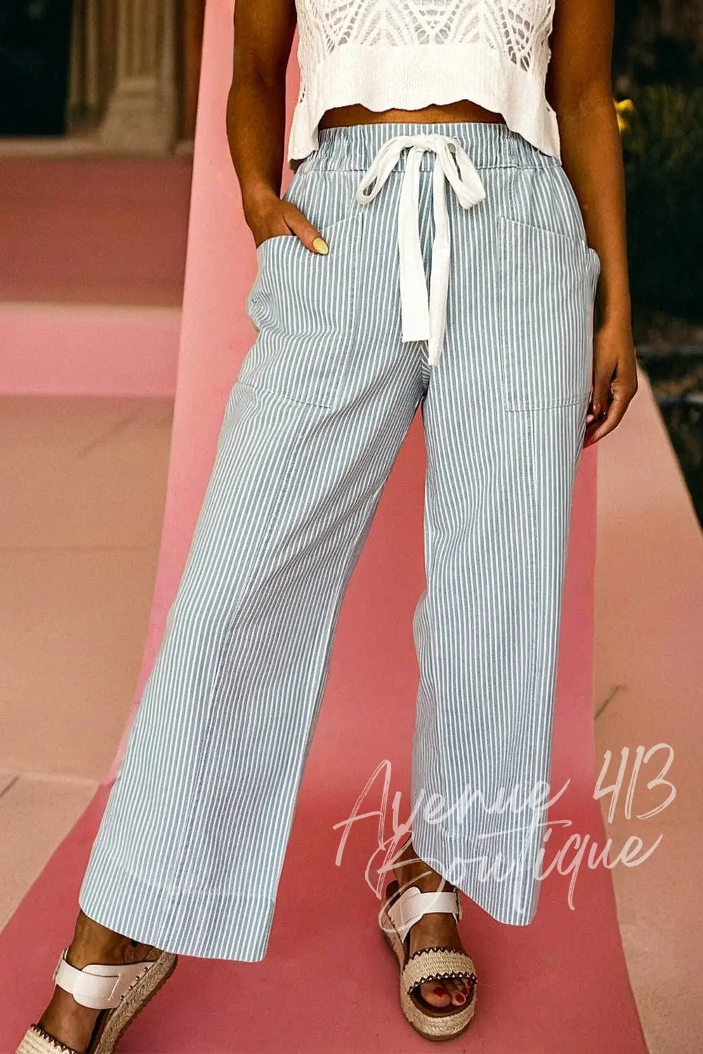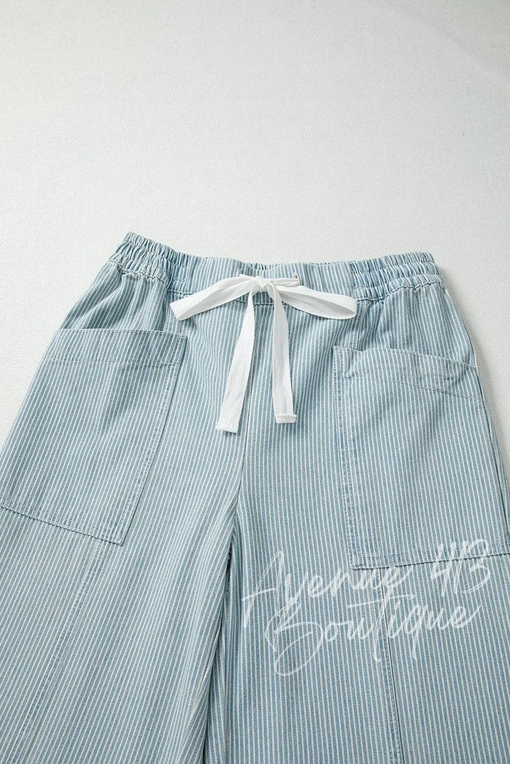 Sky Blue Stripe Mid Rise Drawstring Waist Jeans: Sky Blue Stripe / 85%Cotton+15%Polyester / 6