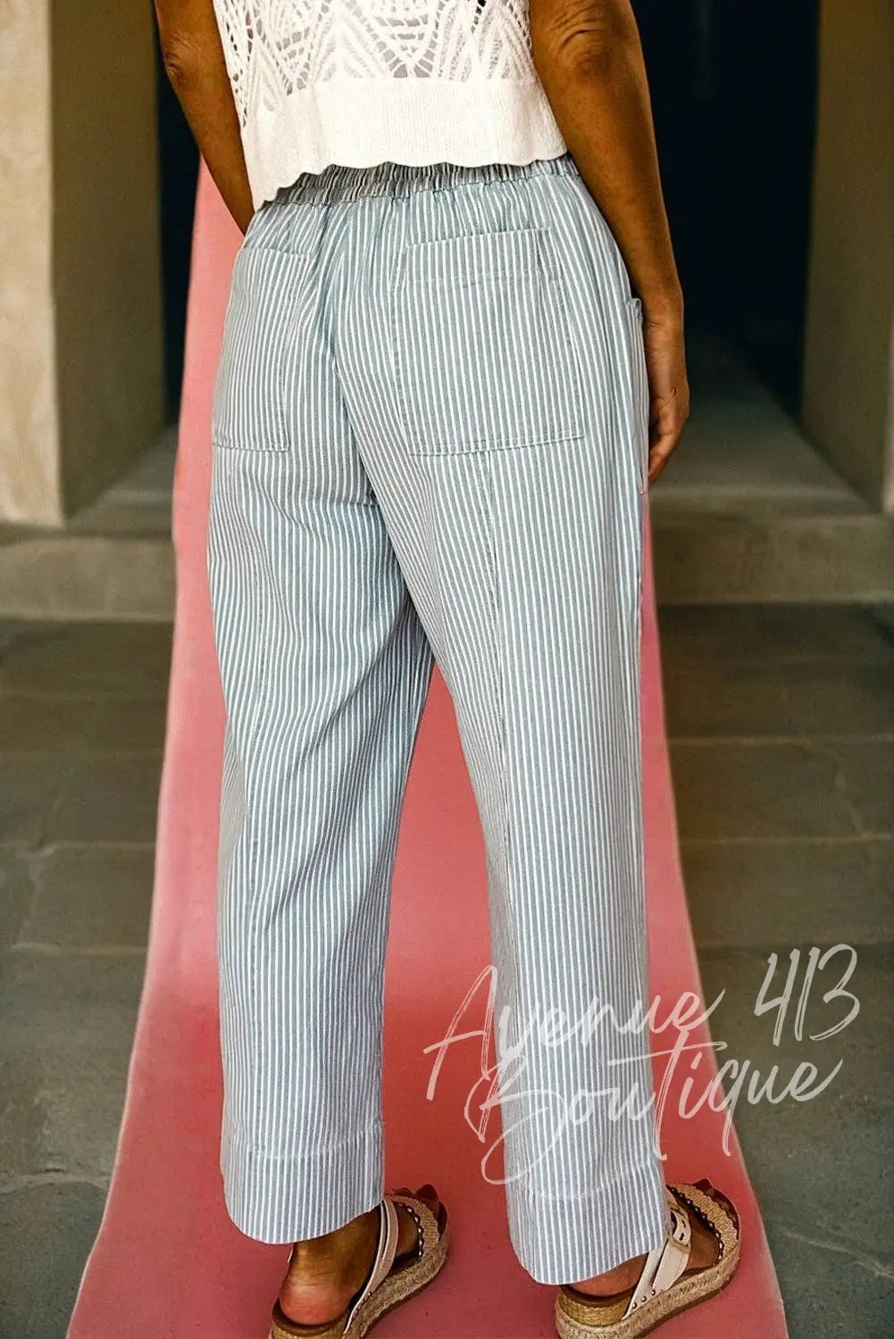 Sky Blue Stripe Mid Rise Drawstring Waist Jeans: Sky Blue Stripe / 85%Cotton+15%Polyester / 8