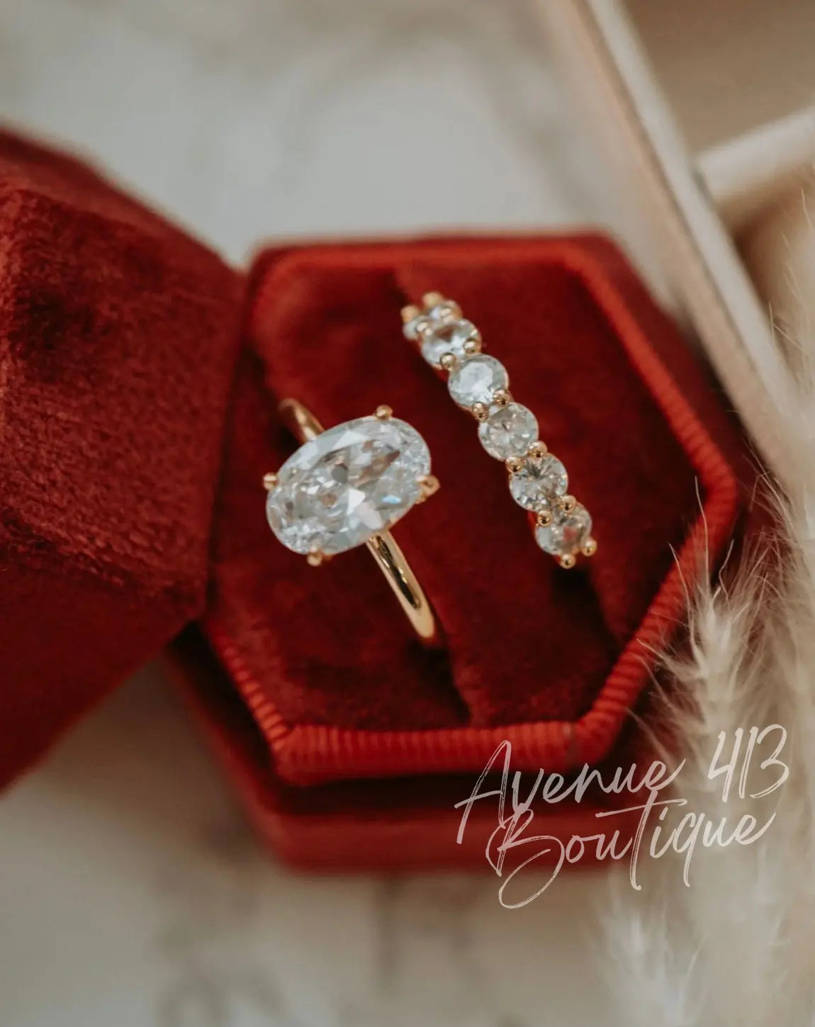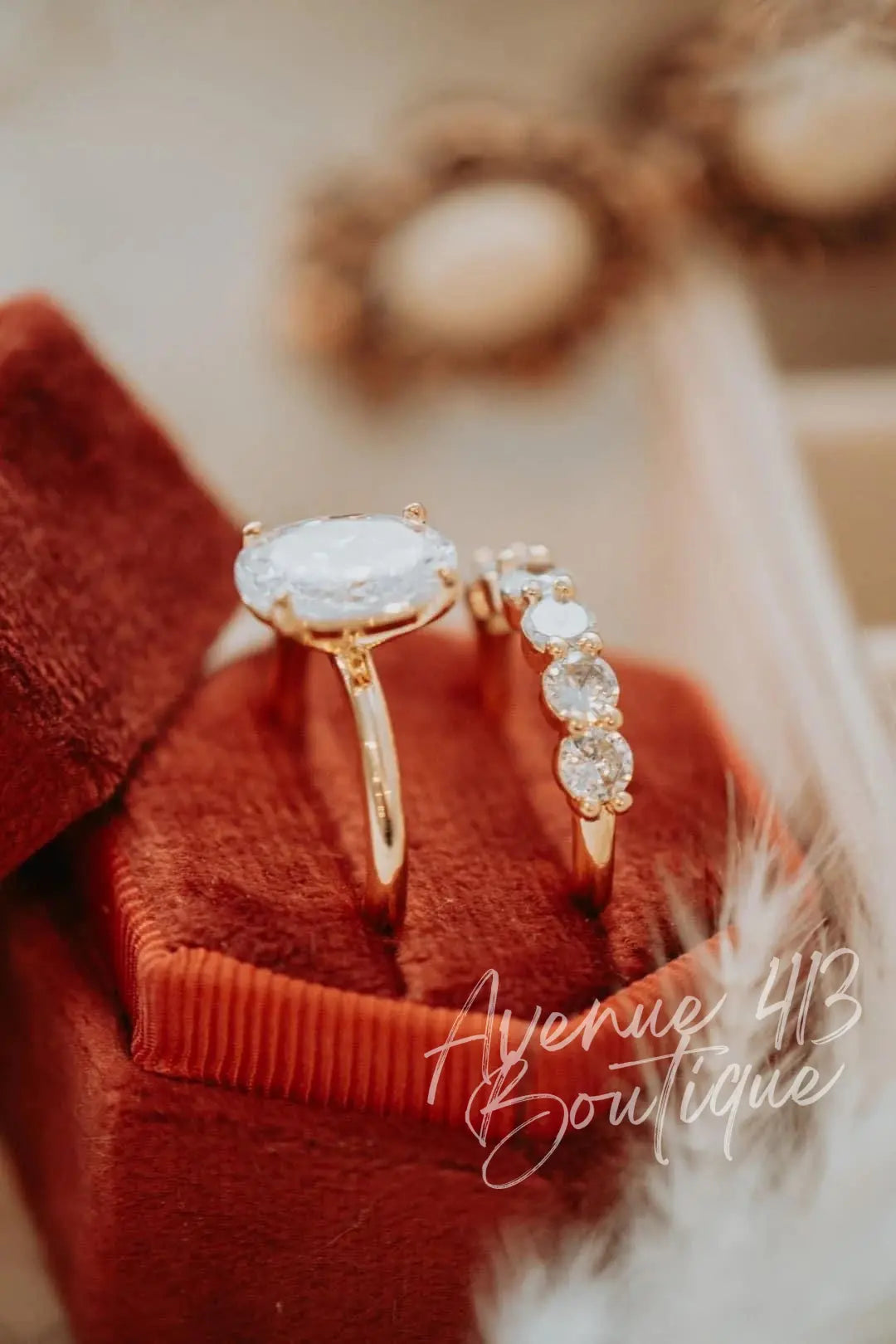 The Estelle 2-Piece Champagne Gold Ring Set is a timeless blend of elegance and sparkle. This beautiful set features a radiant oval-cut center stone paired with a coordinating band adorned with shimmering accent stones for a perfectly balanced, layered look.