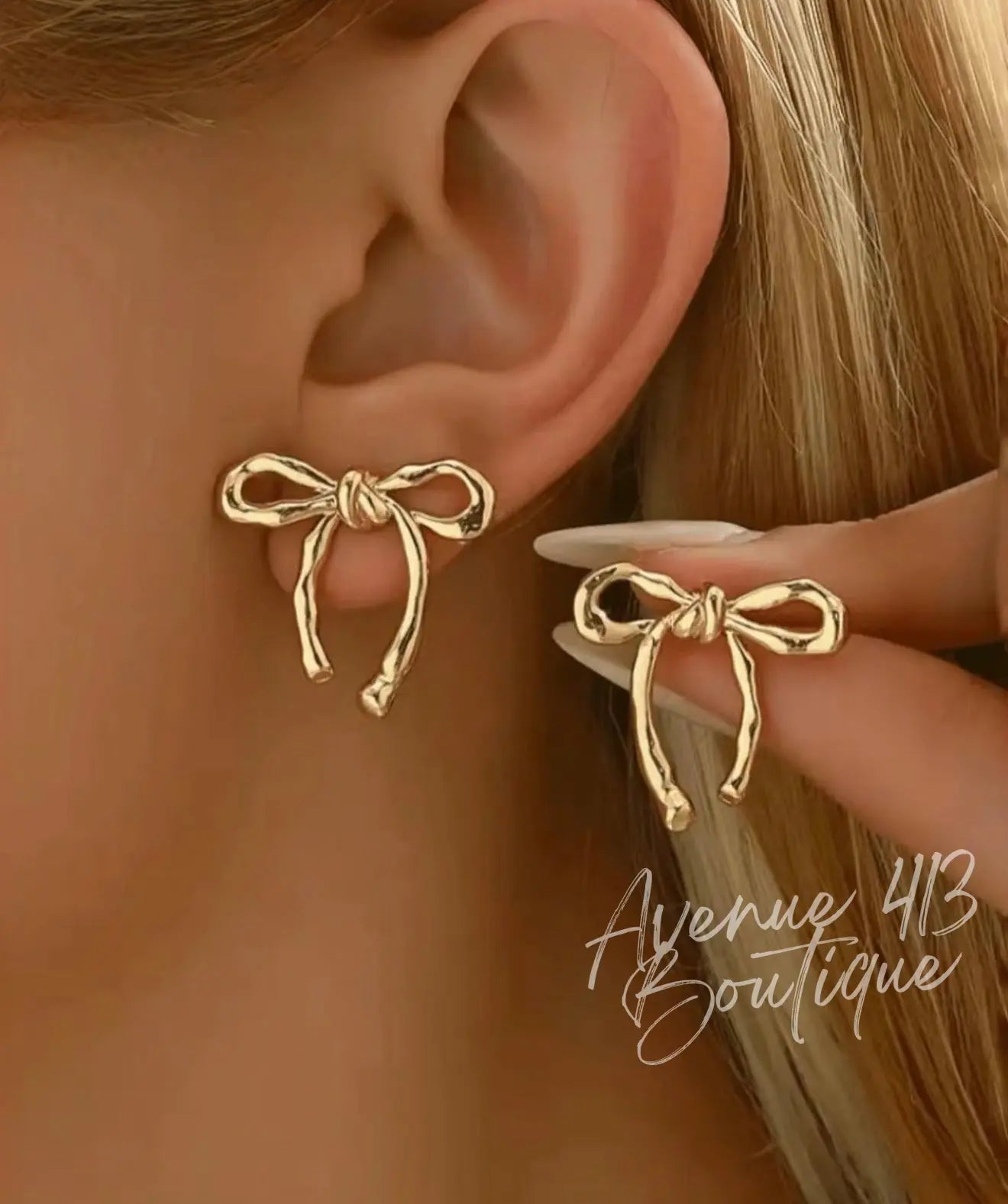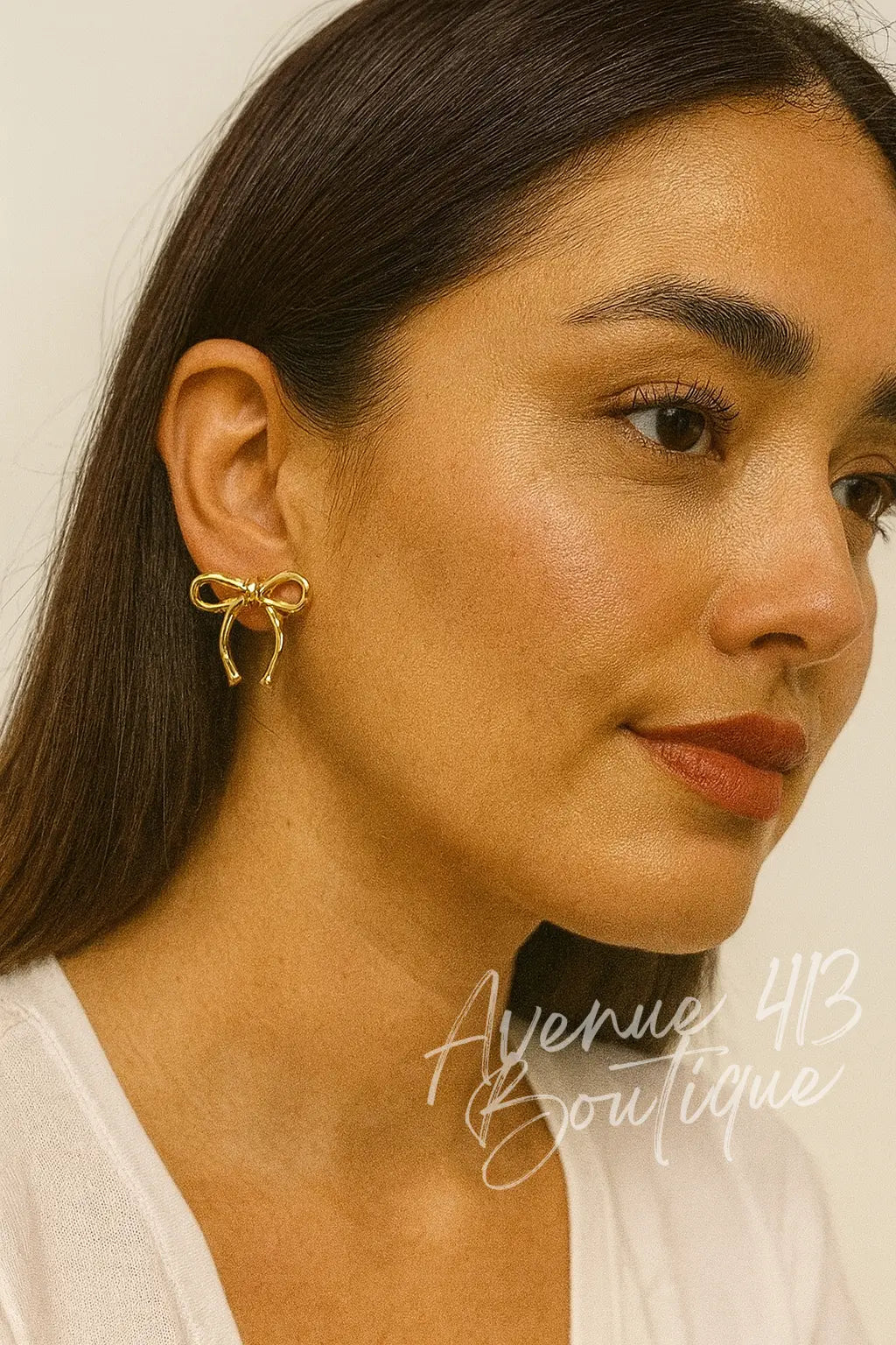 Add a touch of sweet, feminine charm with these Gold Ribbon Bow Studs. Designed with a hand-tied ribbon look and a shiny polished finish, these earrings are the perfect blend of delicate and stylish. Lightweight and effortless, they pair beautifully with cozy sweaters, holiday outfits, date-night looks, and everyday glam.