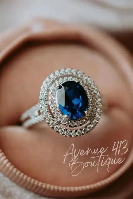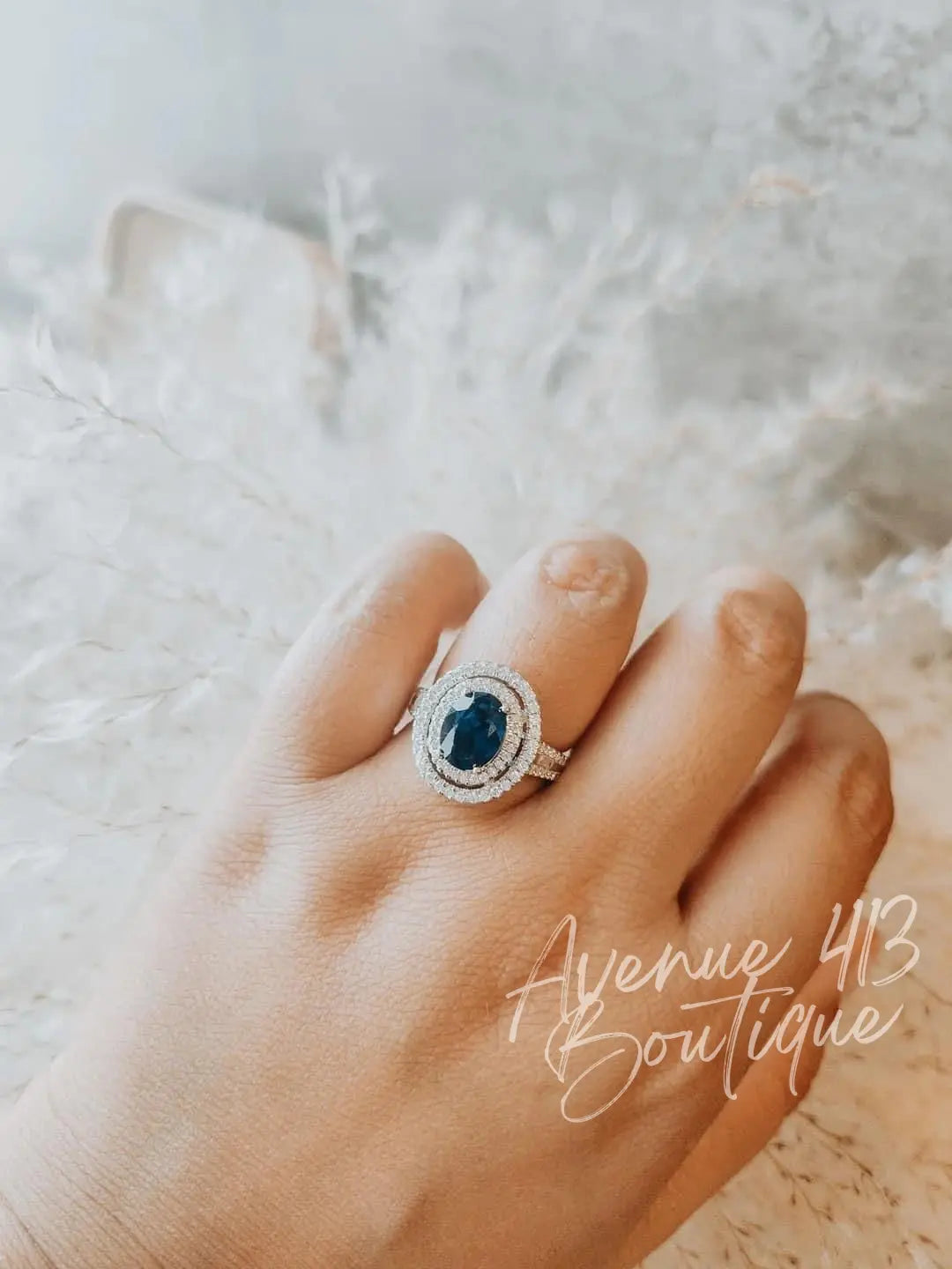 Classic with a touch of sparkle, the Winnie Sapphire Ring features a deep blue oval-cut sapphire at the center, surrounded by a halo of shimmering clear stones that enhance its rich color and brilliance. Set in polished sterling silver, this ring offers a timeless silhouette that feels both refined and eye-catching.