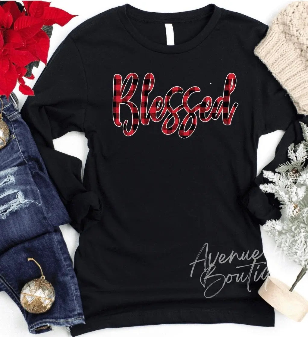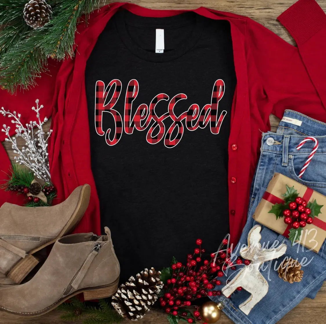 Our Blessed Short Sleeve Tee is the perfect blend of cozy charm and effortless boutique style. The classic black tee features a bold buffalo-plaid script that brings all the warm, festive vibes. Soft, lightweight, and easy to layer, this piece pairs beautifully with cardigans, denim, and your favorite holiday accessories.