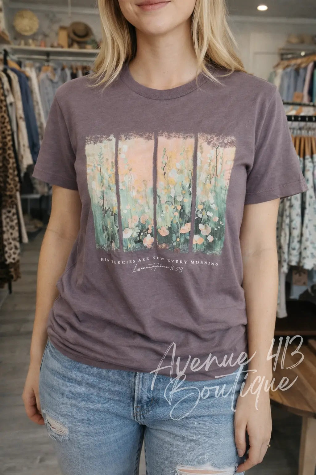 Soft, faith-filled, and effortlessly beautiful — our Morning Mercies Graphic Tee features a dreamy watercolor meadow framed by tall trees in soft blush, sage, and golden sunrise tones. The verse “His mercies are new every morning – Lamentations 3:23” adds a meaningful touch that makes this tee both inspiring and easy to wear.