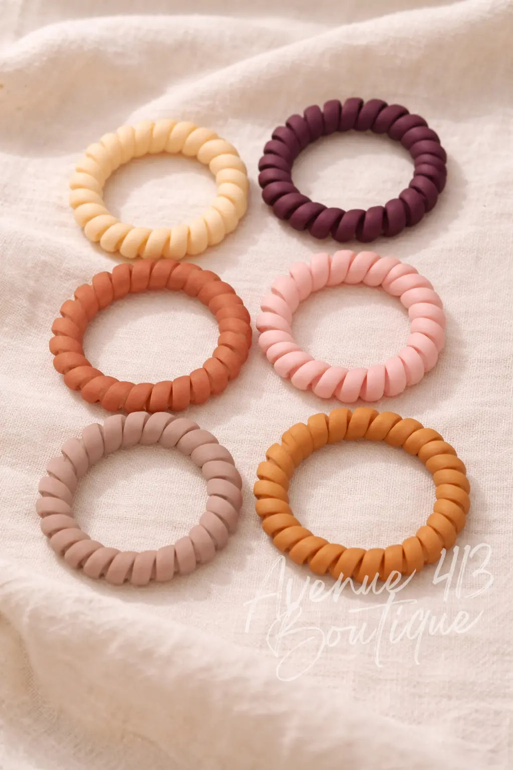 Elevate your everyday hair routine with our Neutral Luxe Coil Hair Tie Set. This curated collection of six soft matte coils features the perfect blend of warm neutrals — from creamy sand and soft blush to cinnamon clay and deep plum.