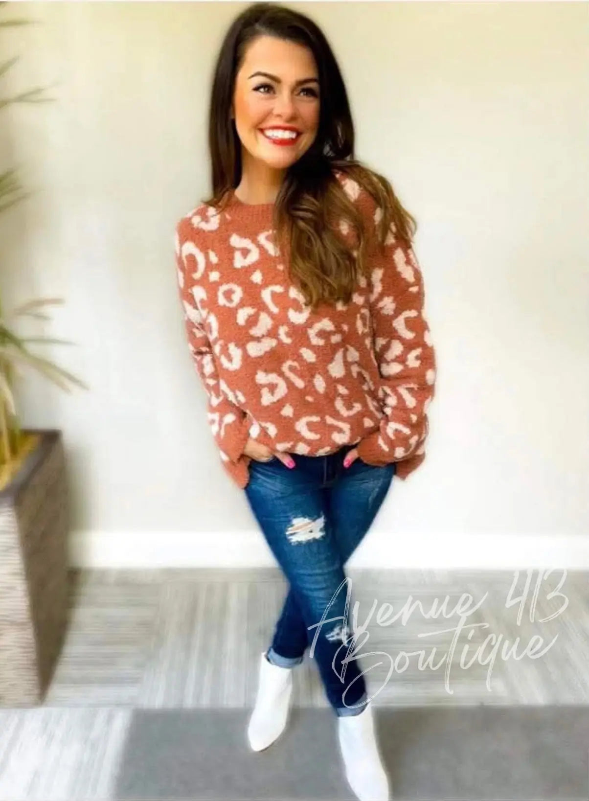 Cozy meets chic in our Rust & Cream Leopard Knit Sweater. Featuring a warm rust base with soft cream leopard print, this sweater is the perfect statement neutral for fall and winter styling.
