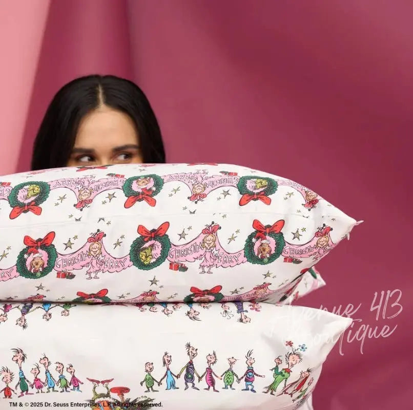 -Features a playful Who-ville print straight from Dr. Seuss’s classic holiday tale