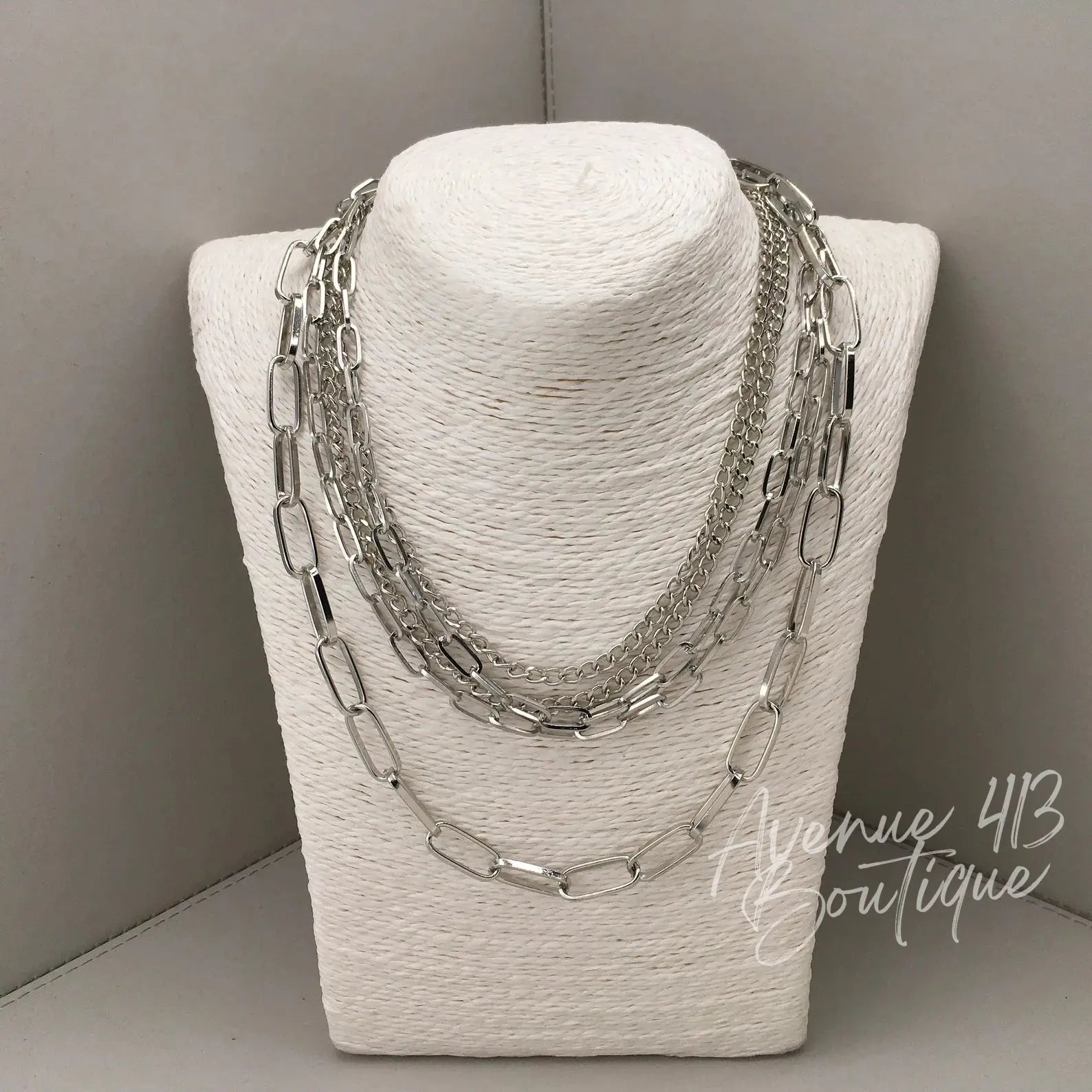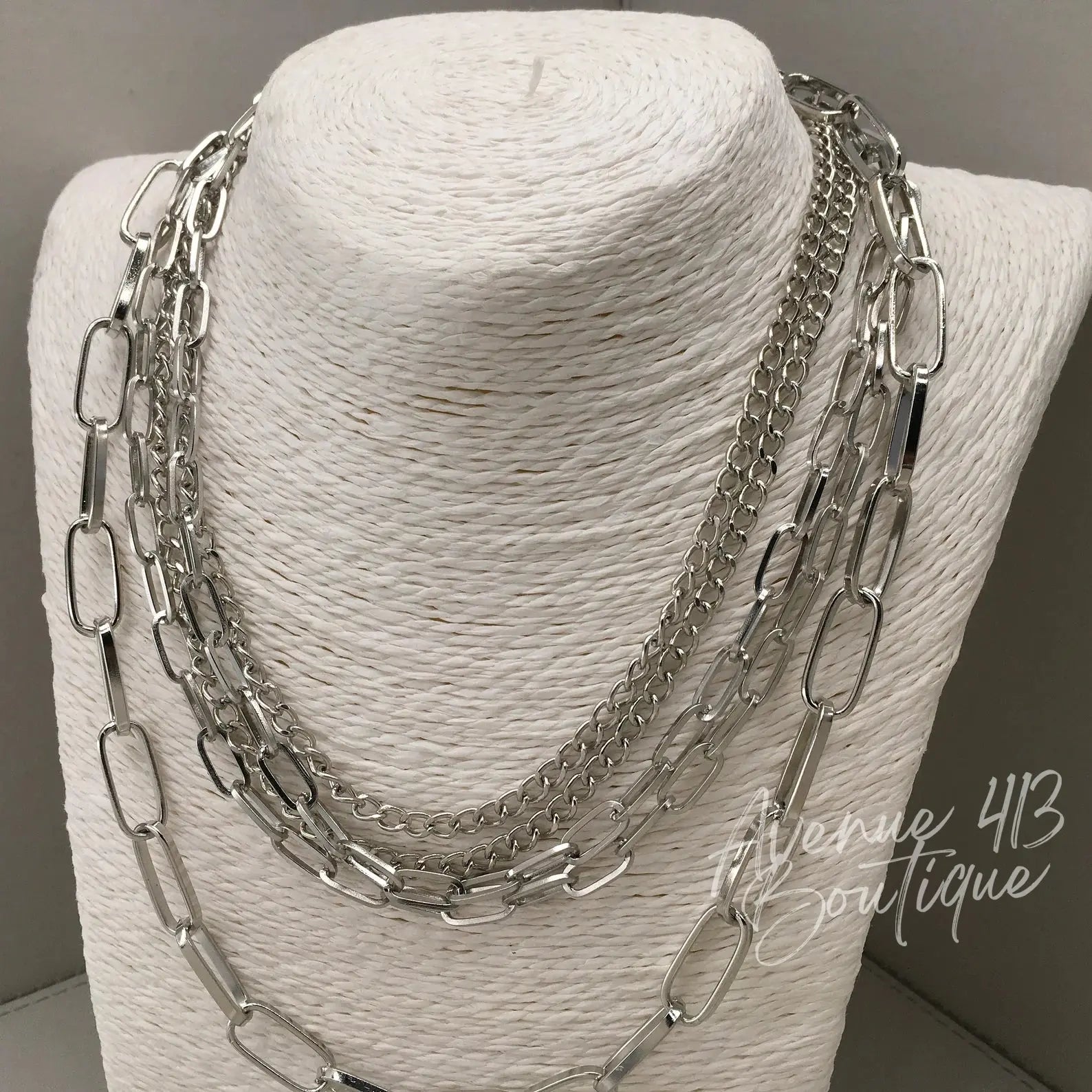 Bold meets effortless. This Triple Layer Silver Chain Statement Necklace features a stunning mix of chain styles layered together for a chic, modern look. Designed to give you the perfectly styled layered effect in one easy piece, it adds instant edge and polish to any outfit.